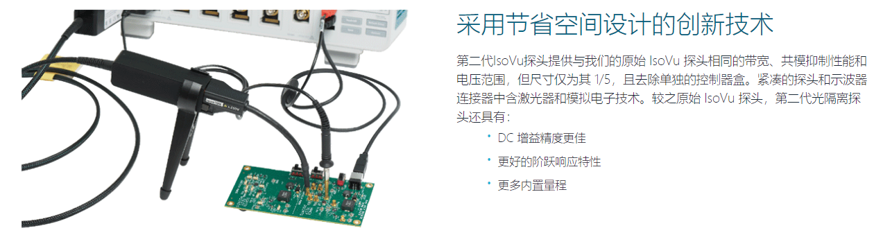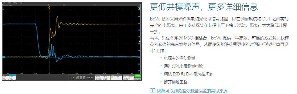 發(fā)現(xiàn)非隔離探頭隱藏的快速震蕩的信號。IsoVu? 探頭技術(shù)實際上通過光學(xué)隔離消除了共模干擾。這樣就可以按 100V/ns 或更快的速度在 ±60kV 的基準(zhǔn)電壓上提供精確的差分測量。借助我們的 IsoVu Generation 2 設(shè)計,您能獲得 IsoVu 技術(shù)的所有優(yōu)勢,但大小僅為原來探頭尺寸的 1/5。