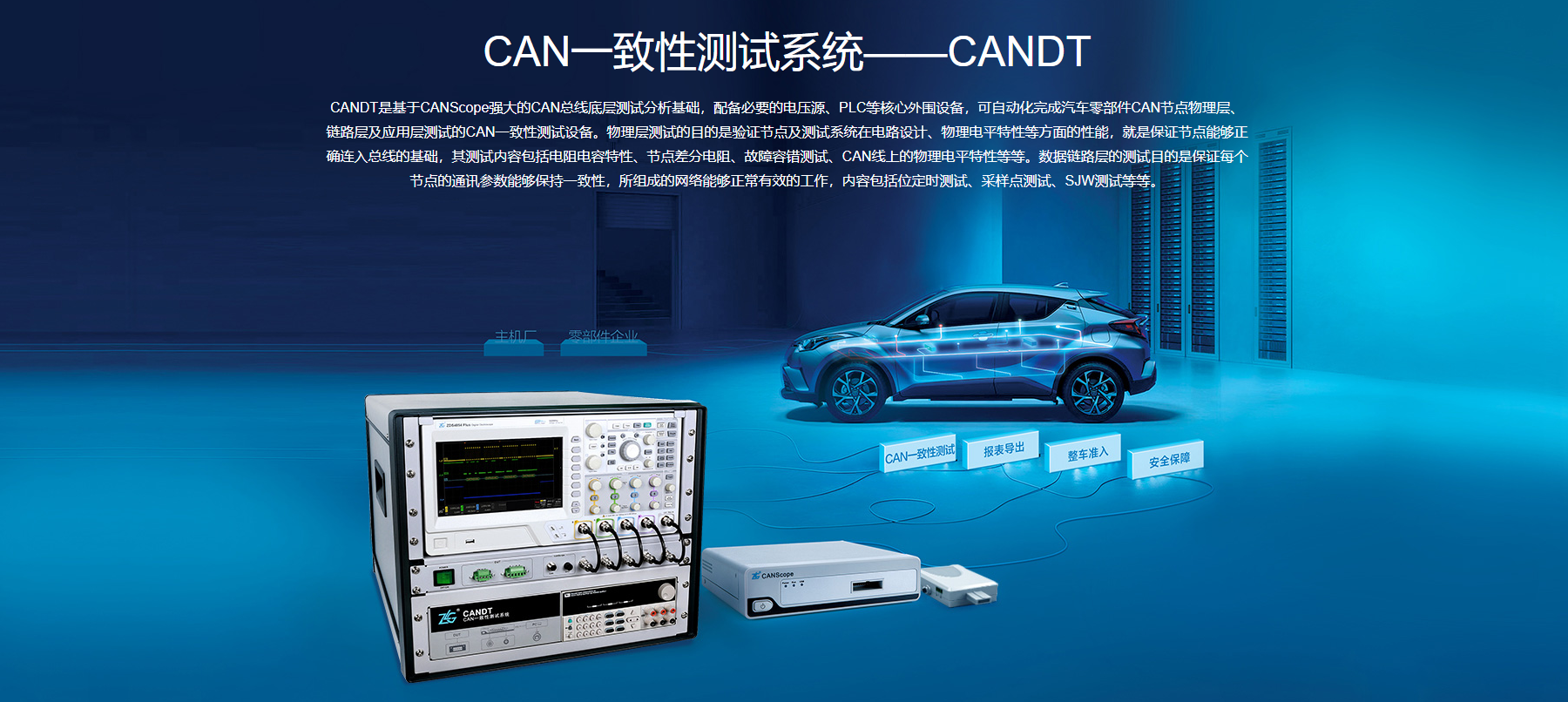 CAN一致性測(cè)試系統(tǒng)以ISO11898標(biāo)準(zhǔn)為核心,圍繞國內(nèi)主流新能源主機(jī)廠CAN總線測(cè)試標(biāo)準(zhǔn)為主要依據(jù),測(cè)試功能滿足物理層、鏈路層、應(yīng)用層的測(cè)試需求。