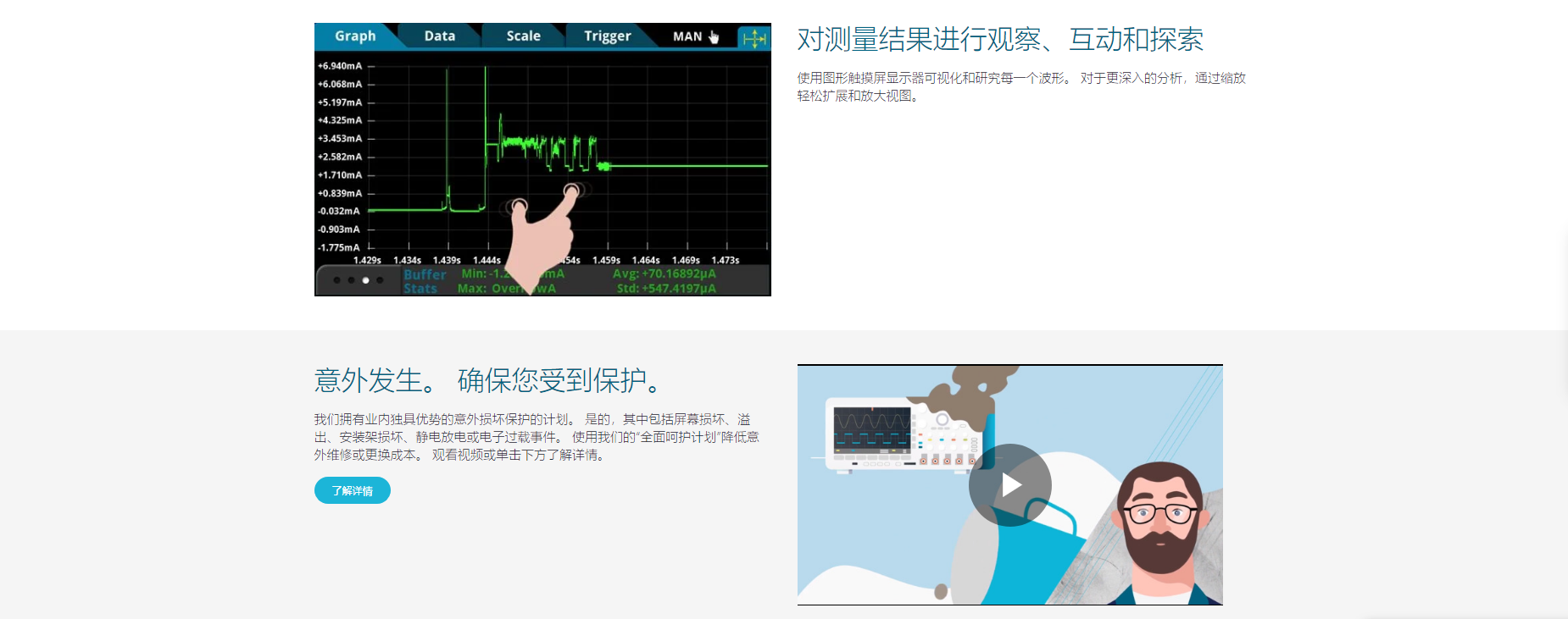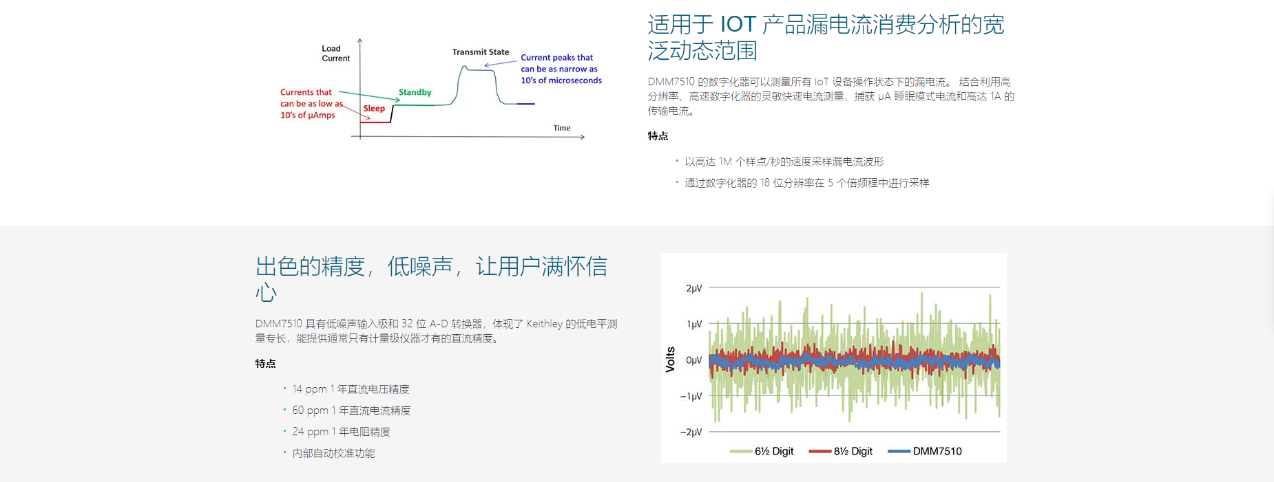 DMM7510 集高精度、高分辨率數(shù)字萬用表 (DMM)、圖形觸摸屏顯示器和高速、高分辨率數(shù)字化器于一身,是第一款圖形采樣萬用表。 其具有 pA 靈敏度和 1M 個(gè)樣點(diǎn)/秒的采樣率,能準(zhǔn)確測(cè)量超低睡眠模式電流和傳輸無線設(shè)備的漏電流。