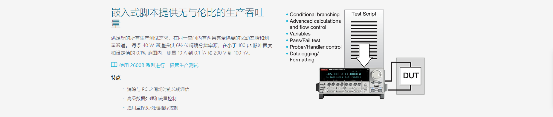 | 2602B | 2 | 10A | 40V | 100fA / 100nV | 200 W | US $15,800 配置和報(bào)價(jià) |